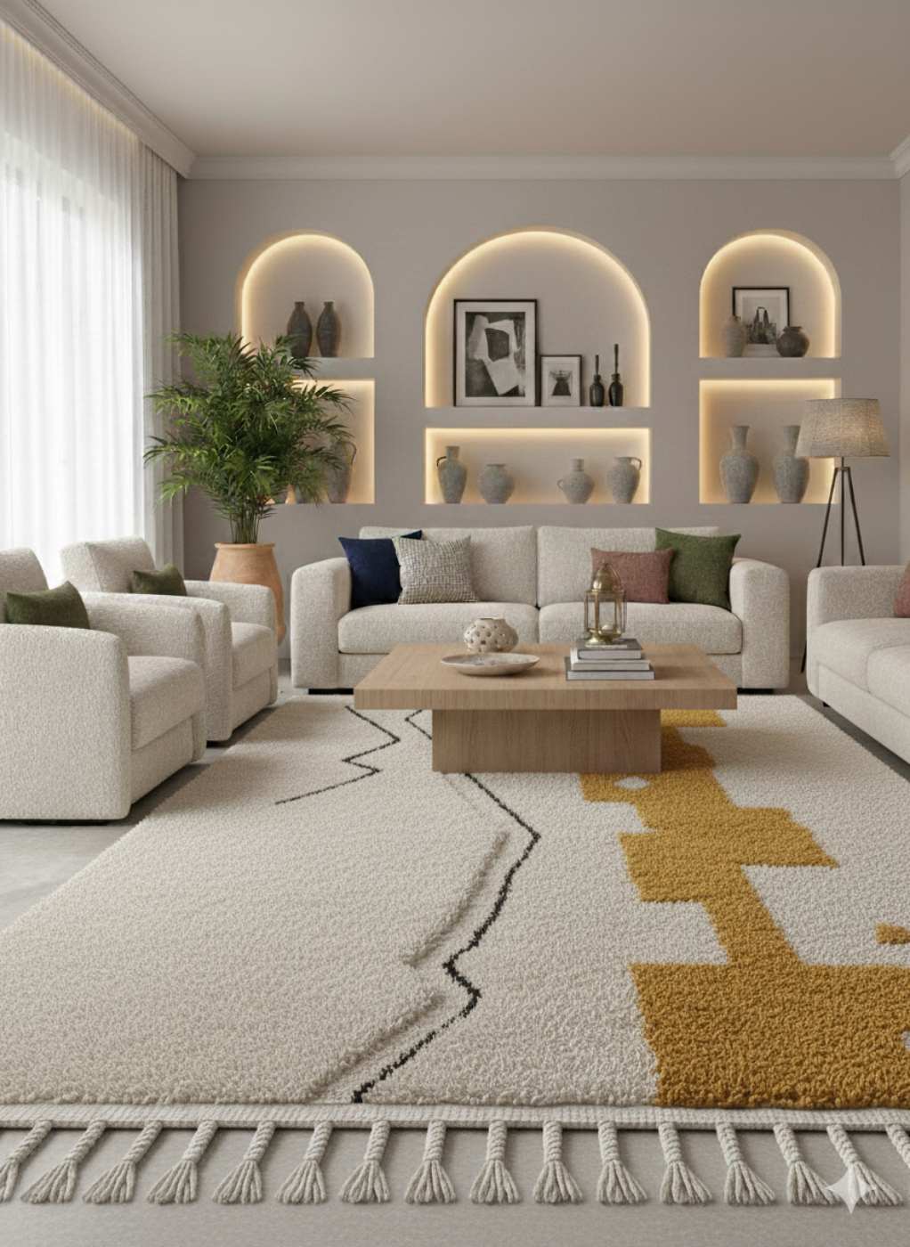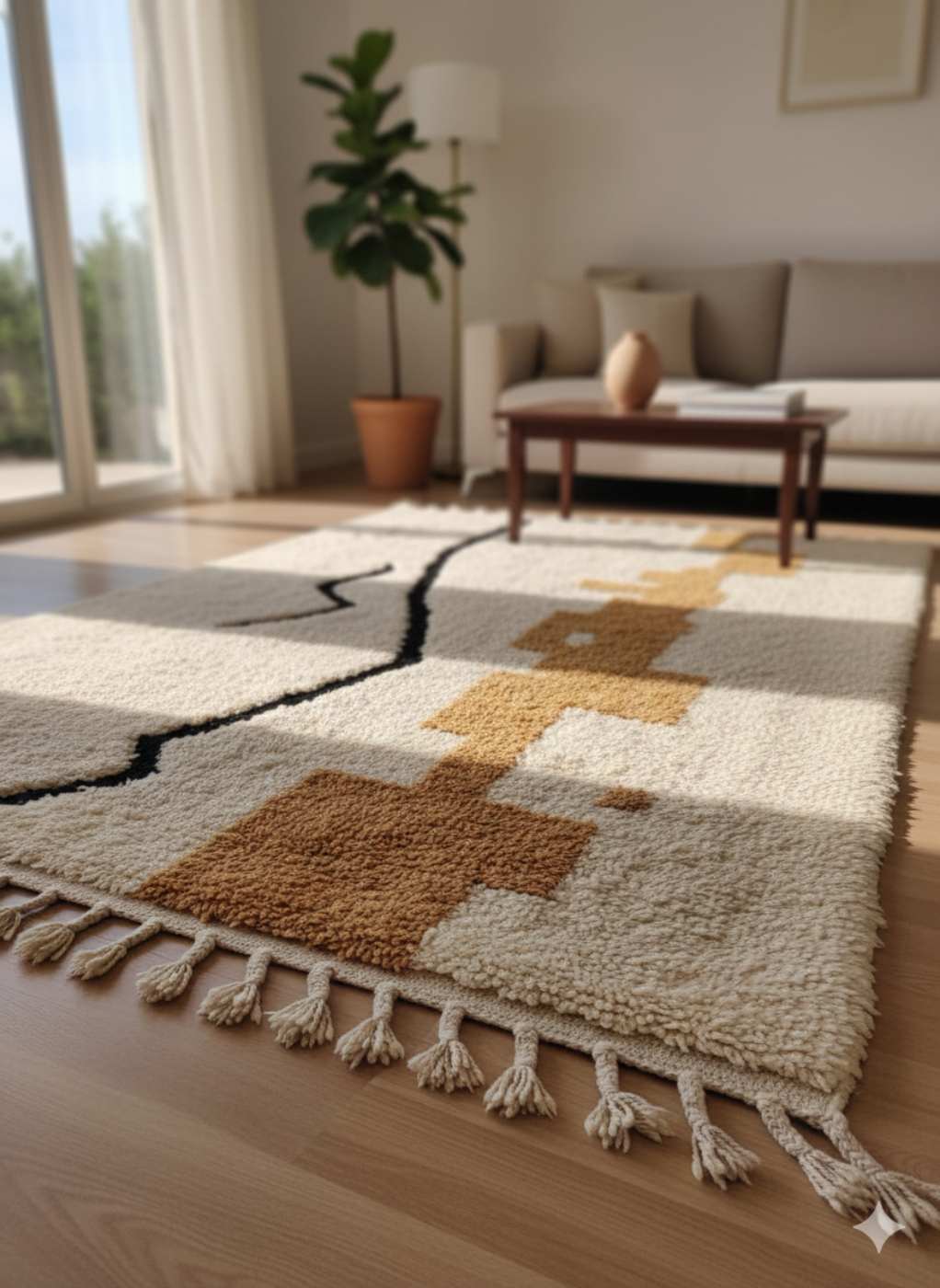 With its captivating abstract motif in a rich saffron yellow, the Anir rug introduces a touch of asymmetry that adds a delightful layer of visual charm. Part of our collection of Moroccan Artisanal rugs for sale in UK, it also reflects the timeless elegance and plush texture found in Moroccan Beni Ouarain rugs, bringing both culture and luxury into your home.